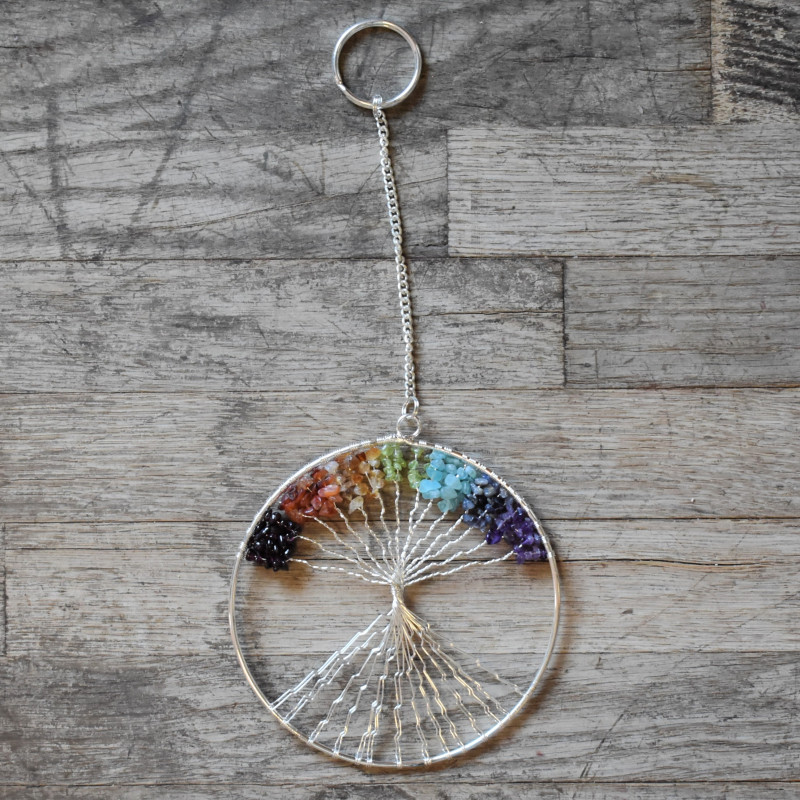 El Árbol de la Vida simboliza conexión, crecimiento y protección, mientras que los minerales de los chakras ayudan a equilibrar la energía y potenciar la armonía interior.