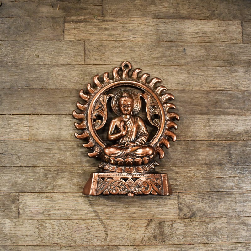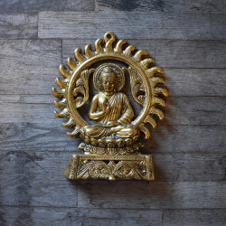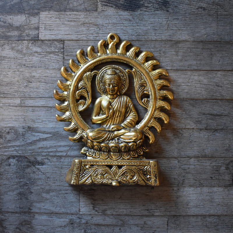Una pieza decorativa espiritual con diseño dorado y compartimentos rellenos de chips de minerales de colores, perfecta para colgar en paredes, puertas o espacios de meditación.