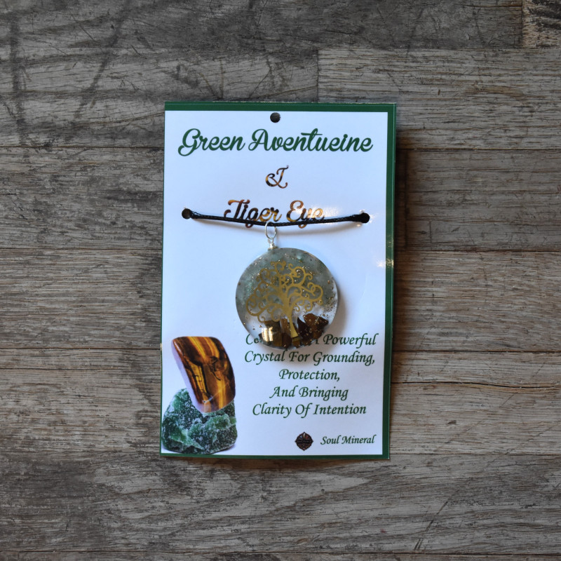 Elegante collar con diseño del Árbol de la Vida, elaborado con aventurina y ojo de tigre, pensado para atraer buena suerte, equilibrio y protección energética. Cada pieza es artesanal y única, perfecta como amuleto personal o regalo esotérico.