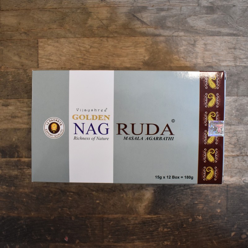Incienso Golden, fragancia palo santo salvia blanca, calidad masala. Este conocido incienso tiene como ingredientes especiales la PLUMERIA, conocido en occidente como el ingrediente frangipani (amapola). Esta especialmente mezclado y formulado con una resina semi-liquida extraída del árbol Ailanthus Malabarica que le da su inconfundible color crema y textura húmeda.