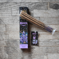 Caja de 12 paquetes de 15g · Varillas orgánicas · Incluye una piedra de amatista