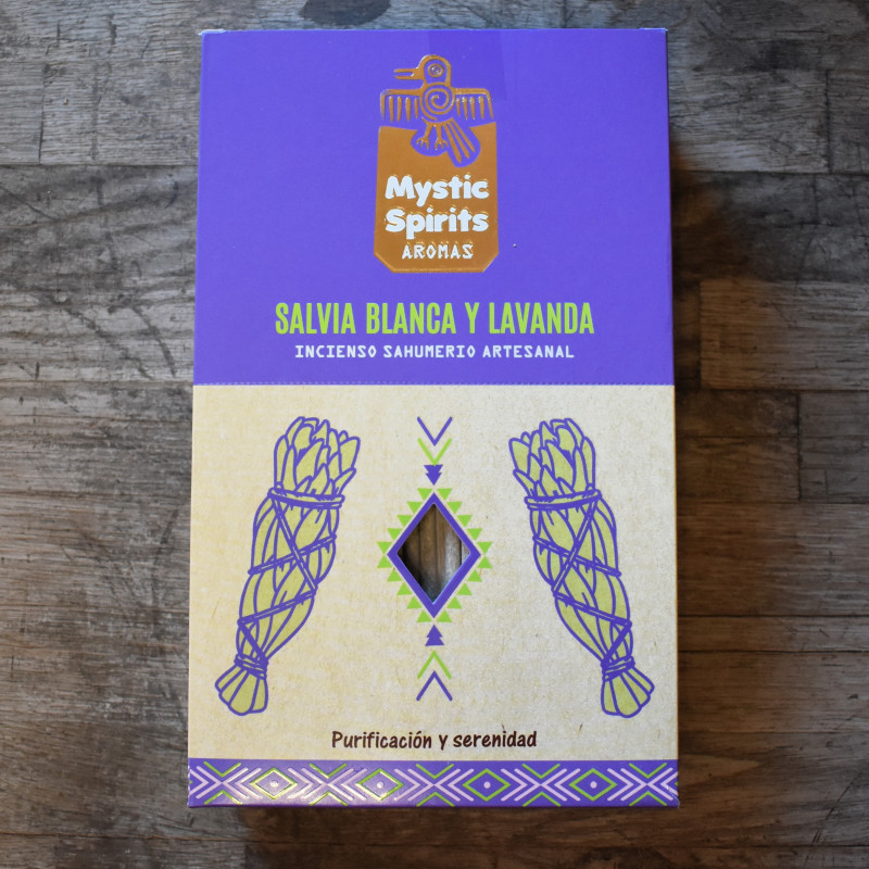 Incienso orgánico premium · Hecho a mano · Serie Mystic Spirits Salvia Blanca · Fragancia Lavanda · Hari Darshan