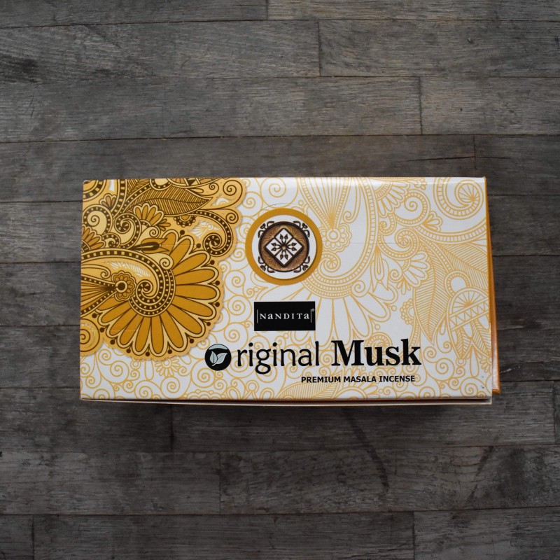 El incienso de NANDITA Original Musk es la verdadera receta tradicional del incienso más popular de la India disfrutado en todo el Mundo. Los Inciensos NANDITA son la combinación única de raras hierbas, resinas y aceites esenciales. Cuando enciendes un incienso NANDITA, te estas asegurando de tener una experiencia segura y natural para ti y tu entorno. Todos los productos utilizados para la elaboración de este incienso son completamente naturales, libres de tóxicos y respetuosos con la campa de ozono y la naturaleza