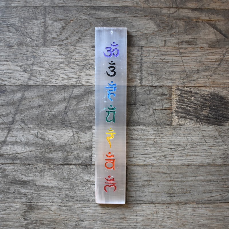 Precioso porta incienso artesanal elaborado en selenita con motivo de los mantras, ideal para utilizar con varillas de inciensos y así aumentar su poder.