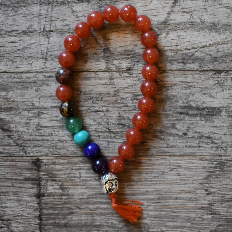 La Cornalina se asocia a la vitalidad y el impulso, mientras que las cuentas de los chakras ayudan a mantener el balance general.
