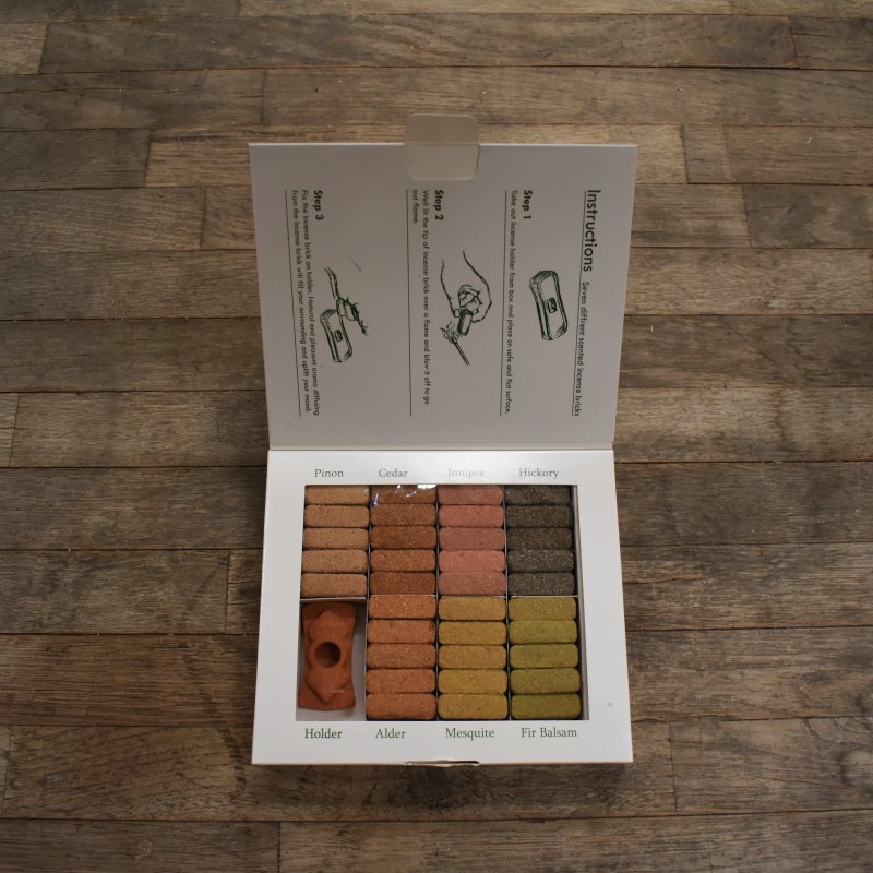 Estos ''ladrillos'' de incienso están elaborados artesanalmente con hierbas y resinas puras, obteniendo una fragancia limpia y fiel a sus componentes. contiene ladrillos de 7 fragancias diferentes típicas de la zona del Himalaya, además incluye un precioso quemador de cerámica