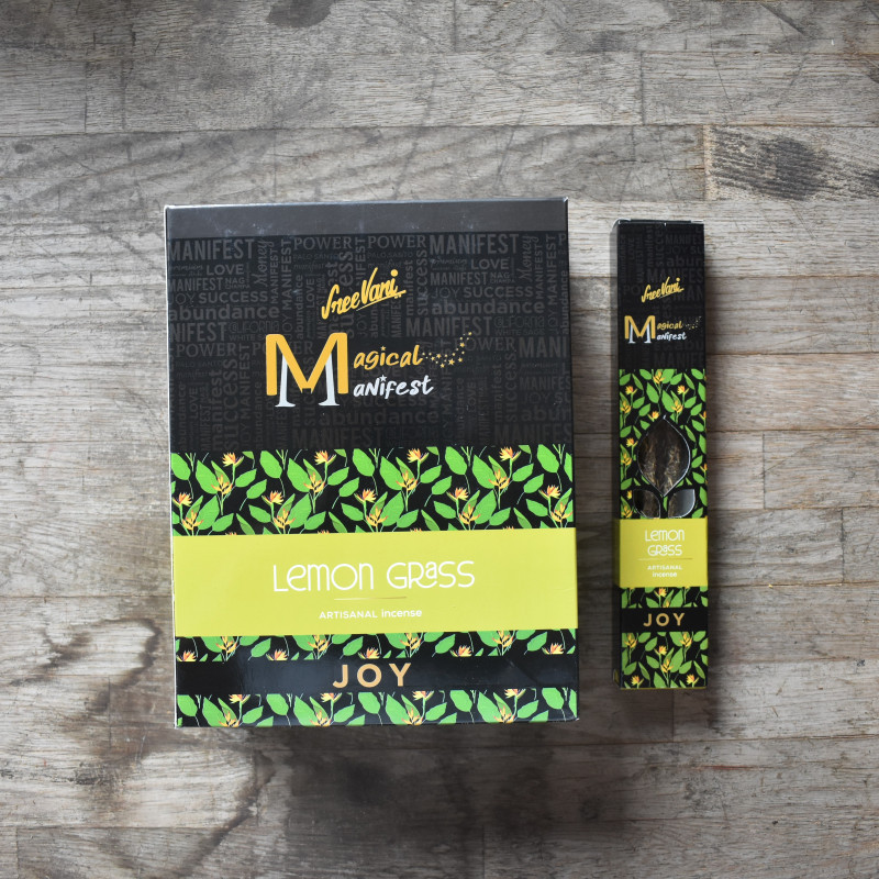 El incienso orgánico Manifest Lemongrass de SREEVANI revitaliza los espacios con un aroma fresco y energizante.