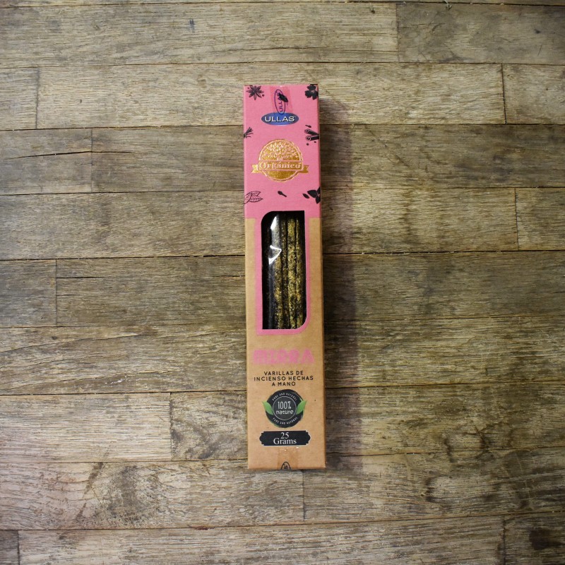 Estas varillas de incienso están elaborados con resinas orgánicas de diferentes procedencias y enriquecidas con sus aceites esenciales naturales. Su fragancia favorece la relajación y meditación como práctica diaria, a la vez que llena el ambiente de un aroma profundamente embriagador. Estas mezclas están hechas según la antigua práctica de las culturas mayas e incas de quemar inciensos en sus rituales. Este incienso orgánico posee un exquisita fragancia a Mirra.