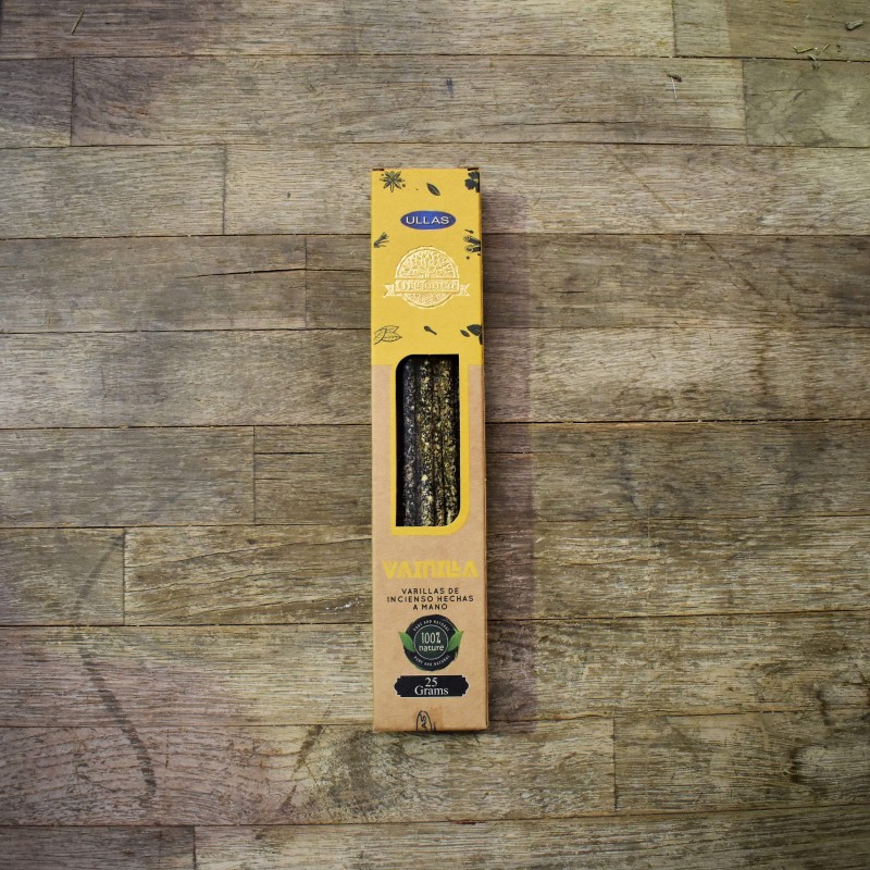 Estas varillas de incienso están elaborados con resinas orgánicas de diferentes procedencias y enriquecidas con sus aceites esenciales naturales. Su fragancia favorece la relajación y meditación como práctica diaria, a la vez que llena el ambiente de un aroma profundamente embriagador. Estas mezclas están hechas según la antigua práctica de las culturas mayas e incas de quemar inciensos en sus rituales. Este incienso orgánico posee un exquisita fragancia a Vainilla.